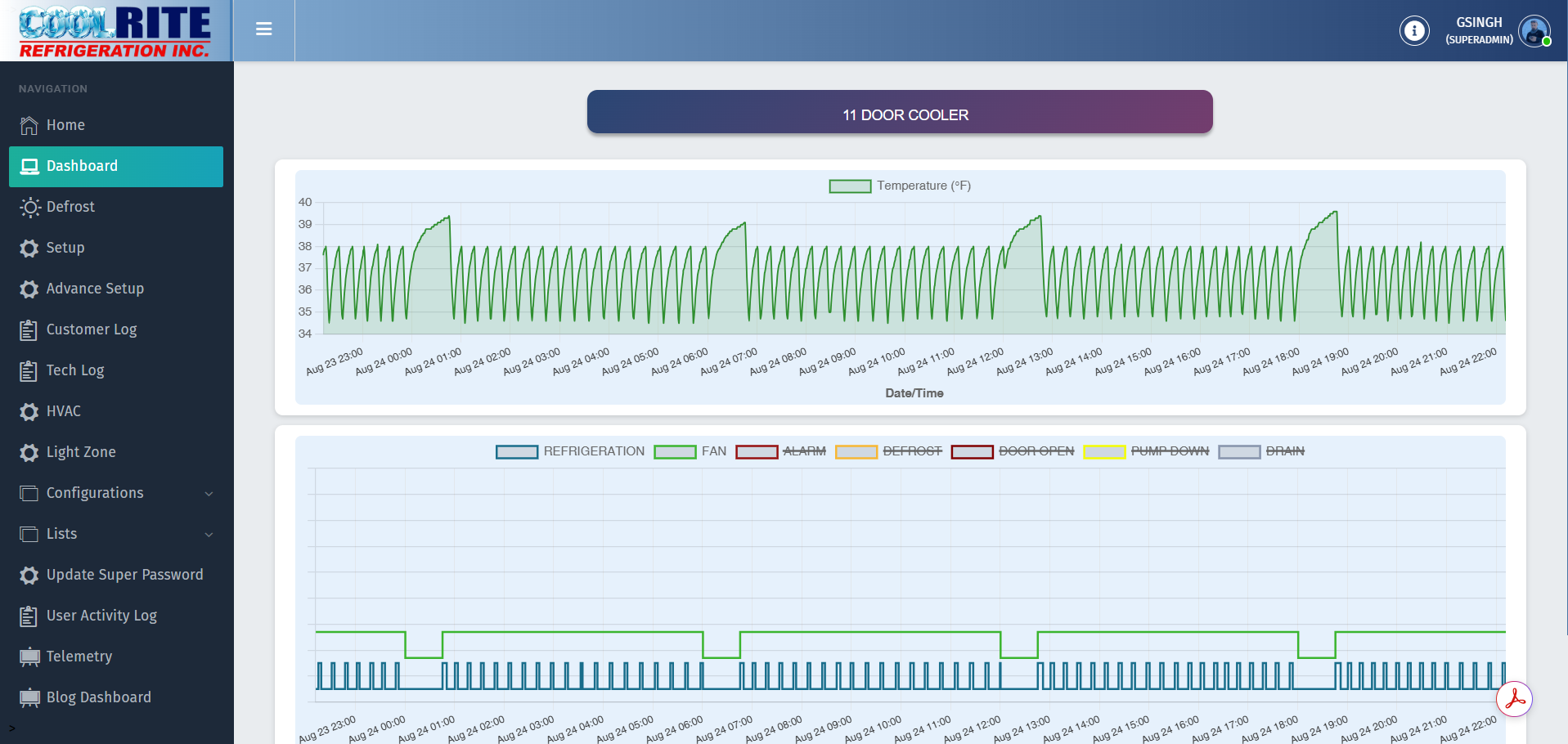 On our CoolriteEMS Smart Refrigeration Dashboard, temperature, fan, defrost, and refrigeration cycles are tracked visually.